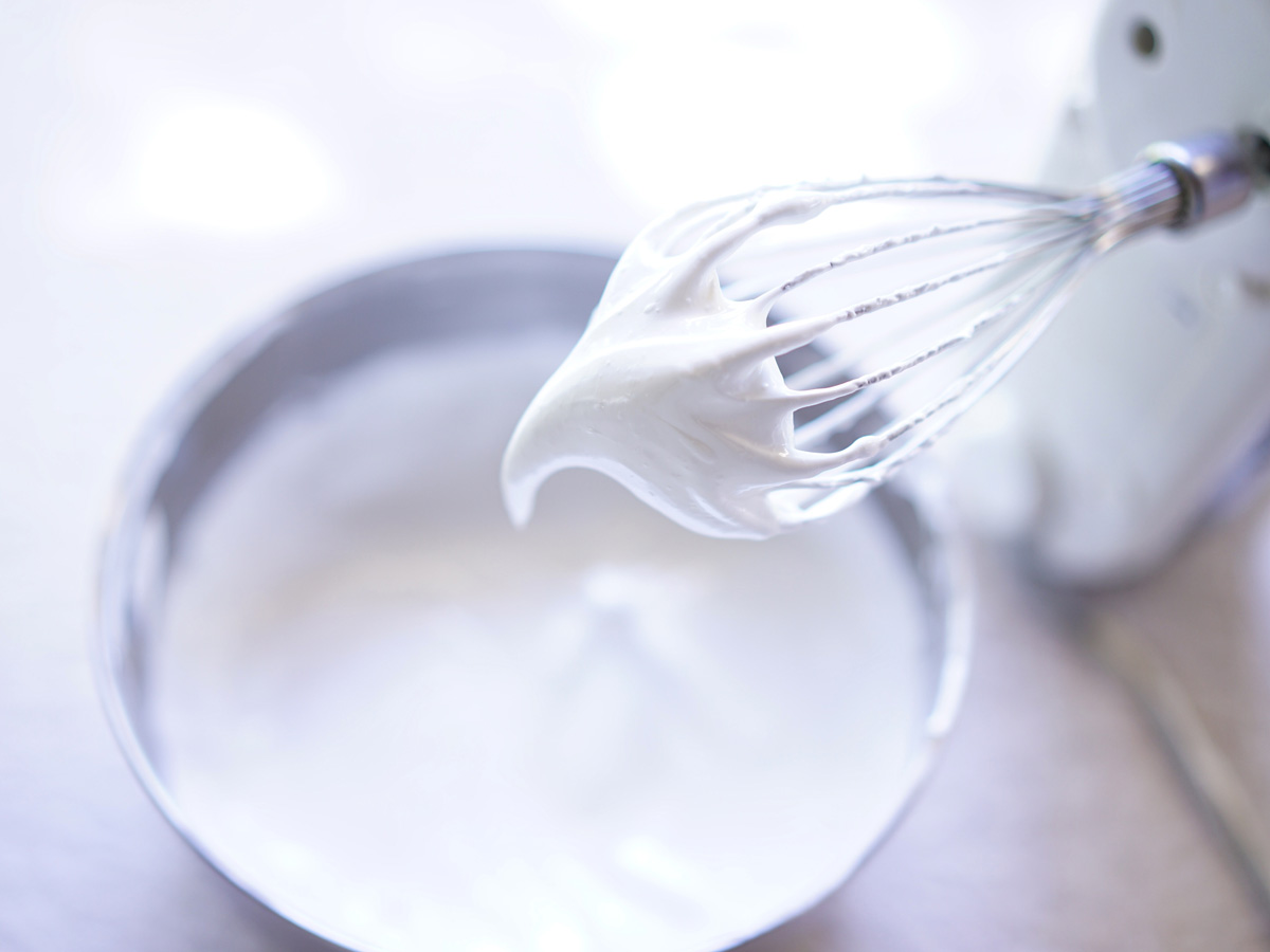 ボウルに卵白とグラニュー糖を入れ、湯煎で50℃を保ちながら、泡立てます。