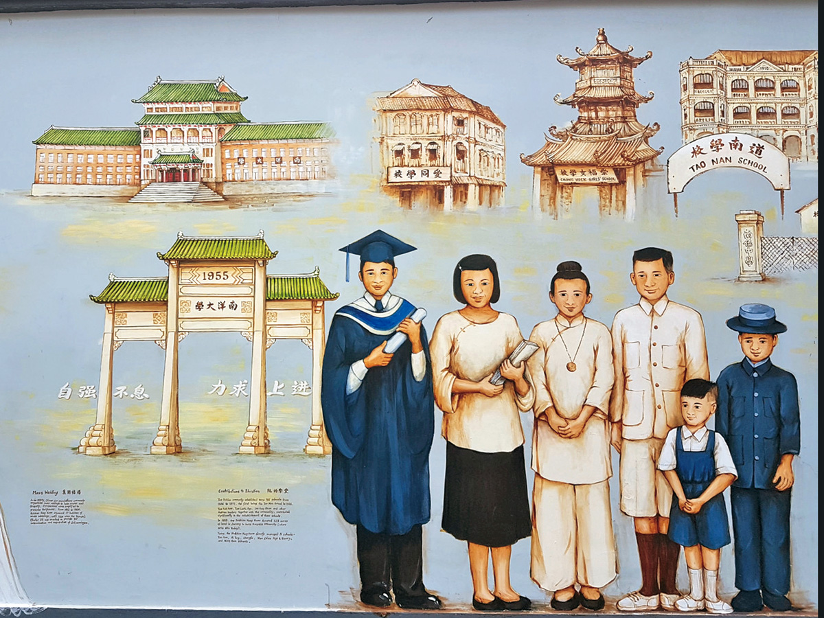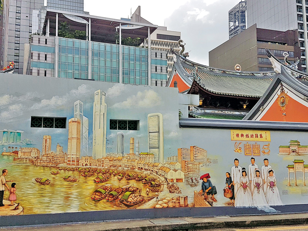 シンガポールにおけるストリートアートの第一人者、イップ・ユーチョン氏が描いた壁画で、「シンガポール発展絵巻」と称されています。1880年代当時の様子と現代を重ね合わせた意欲的な作品で見ごたえがあります。