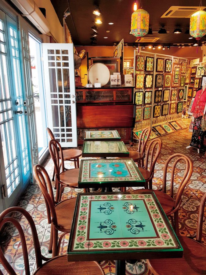 崇文閣カフェはシアン・ホッケン寺院の境内にオープンした、プラナカンの邸宅を再現したカフェ。プラナカンのタイルや工芸品で飾られています。特にタイル装飾が美しく、ニョニャの味も楽しめます。タイルのギャラリーが併設されています。