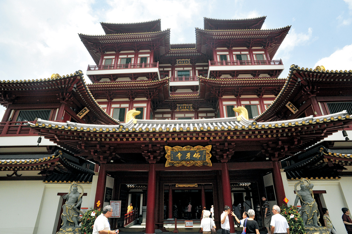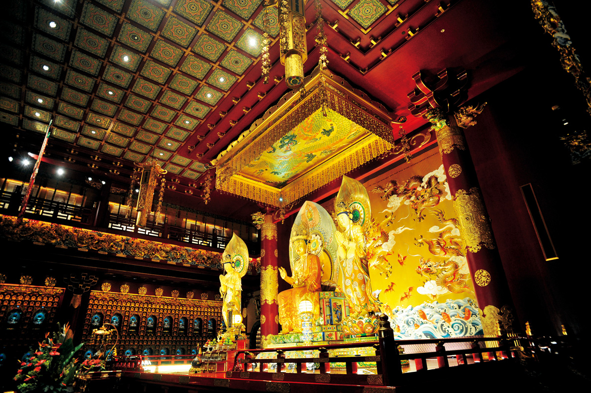 ミャンマーで発見された仏牙を保存する寺院。チャイナタウンの中心部に仏教寺院がなかったことから、2007年に建てられました。堂内には黄金の仏像群が鎮座し、2・3階は博物館。