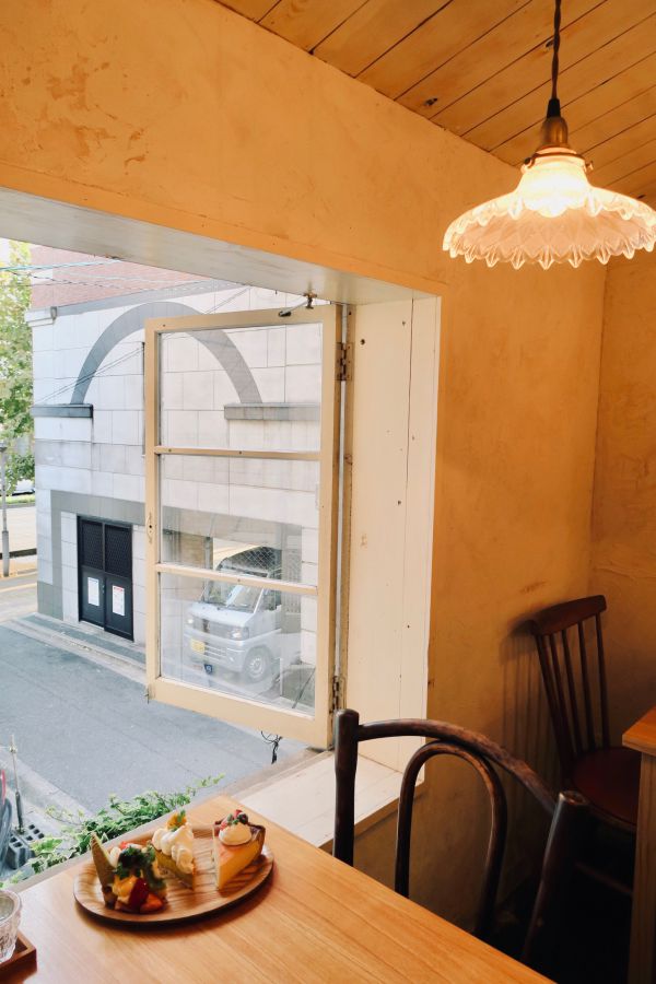 1階のショーケースで好きなケーキを選んだら、2階のカフェスペースへ。おすすめは大きな窓から通りを見下ろせる窓際の席。白塗りの壁と木目の温もりを感じる家具が調和した、ホッコリ和める空間です。