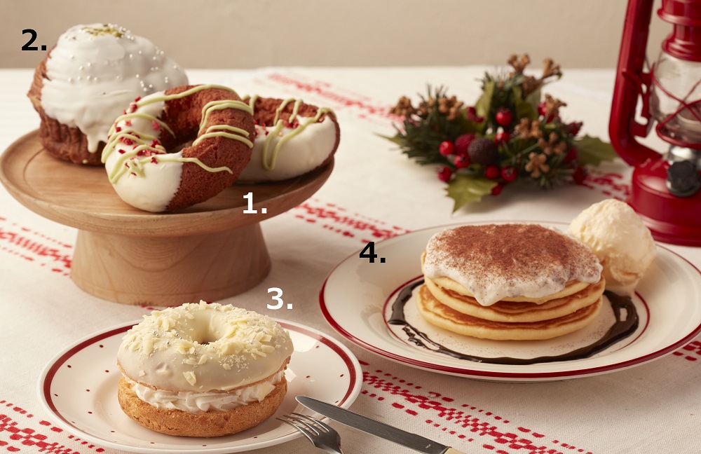 「スノーコンチ」(2)310円は、華やかでかわいらしいストロベリーテイストのオールドファッションと、巻貝のような形が印象的なチョコレート風味のデニッシュ。ホリデーシーズンのパンケーキは、「クラシックパンケーキラムレーズンバニラ」(4)740円。ちょっぴり大人な味です。