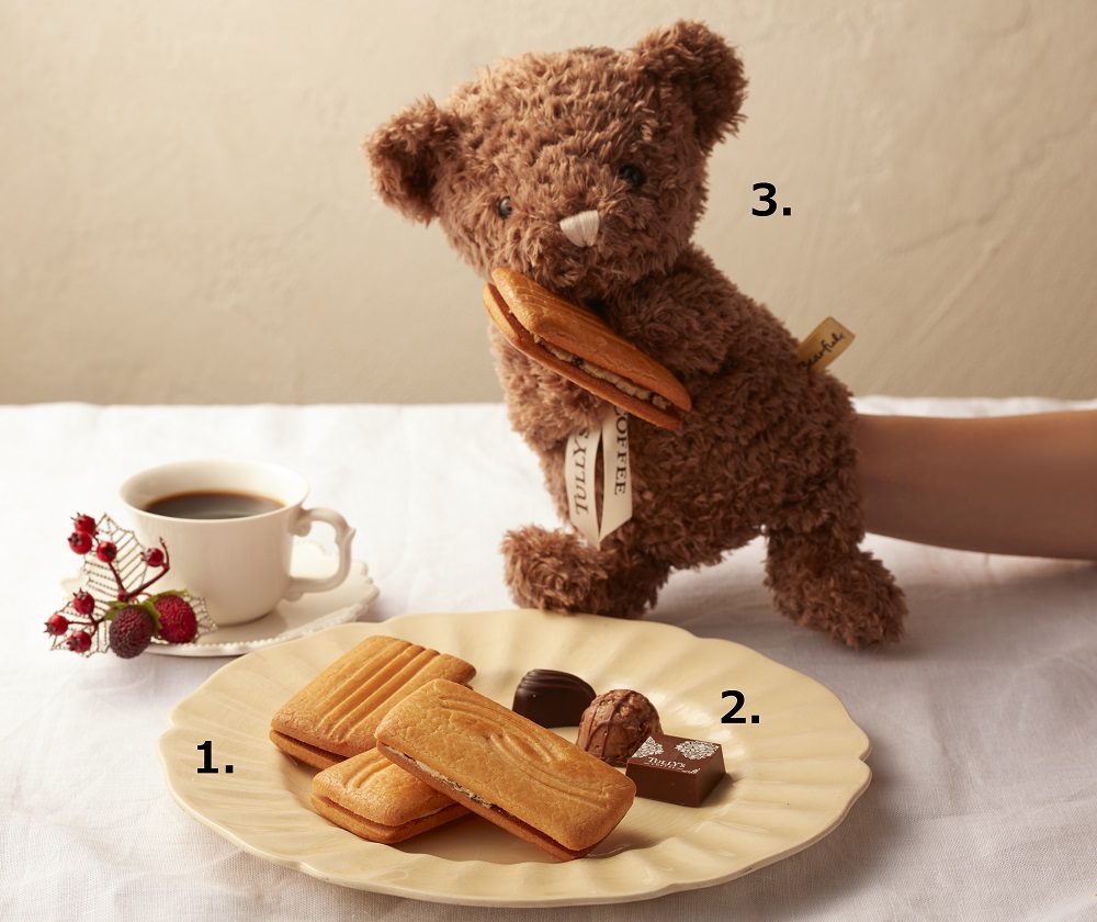 3種の味わいがアソートになった「タリーズチョコレートテルゼット ファッシーノ」(2)320円は、カジュアルギフトにもおすすめです。11月27日(水)から発売のテディベア「パペットベアフル®(モカ)」(3)1530円と一緒にいかがですか。