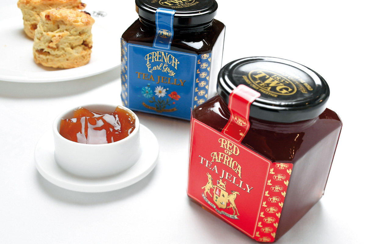 ティー・ジェリー各S$19は赤はシトラス・ティー、青はアールグレイの香り。スコーンやパンなどにいかが?