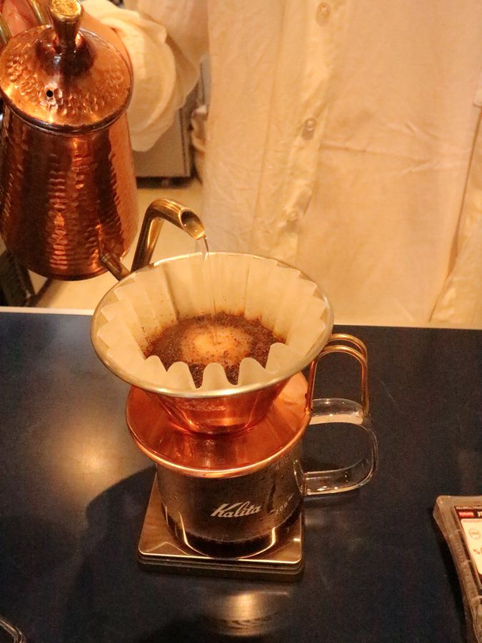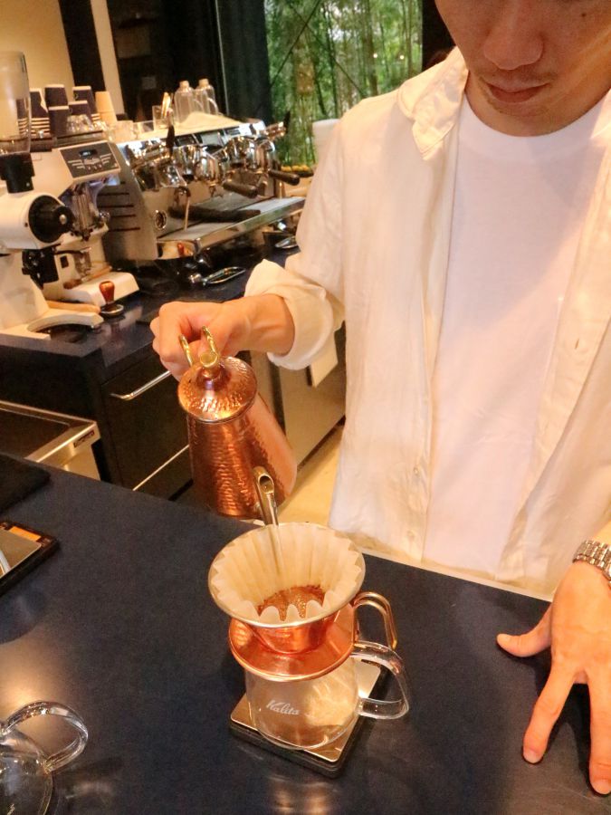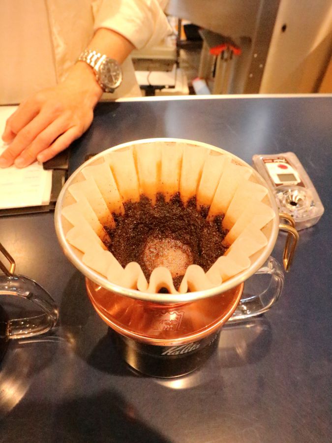 浅煎りのときは、コーヒーの成分を均一にするために、お湯を注ぎ終わってから、下のサーバーごとコーヒーをふわっと回します。