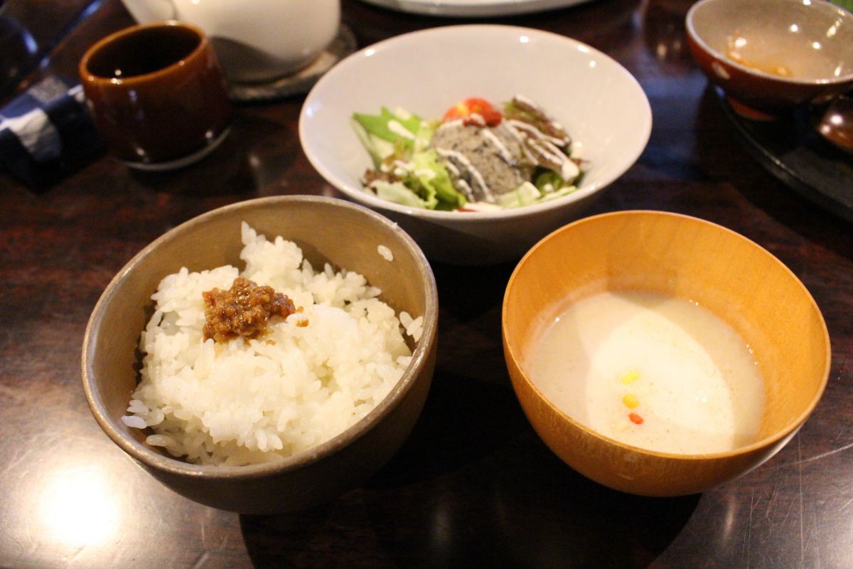あわせて、肉味噌がちょこんとのったかわいいご飯と、ほんのり甘めな味付けのポタージュ、副菜にはポテトサラダがついてきます。こちらも明日香村のお米などを使用した、まさに地元満喫なラインナップ。女性の方にもちょうどよい量なのではないでしょうか。