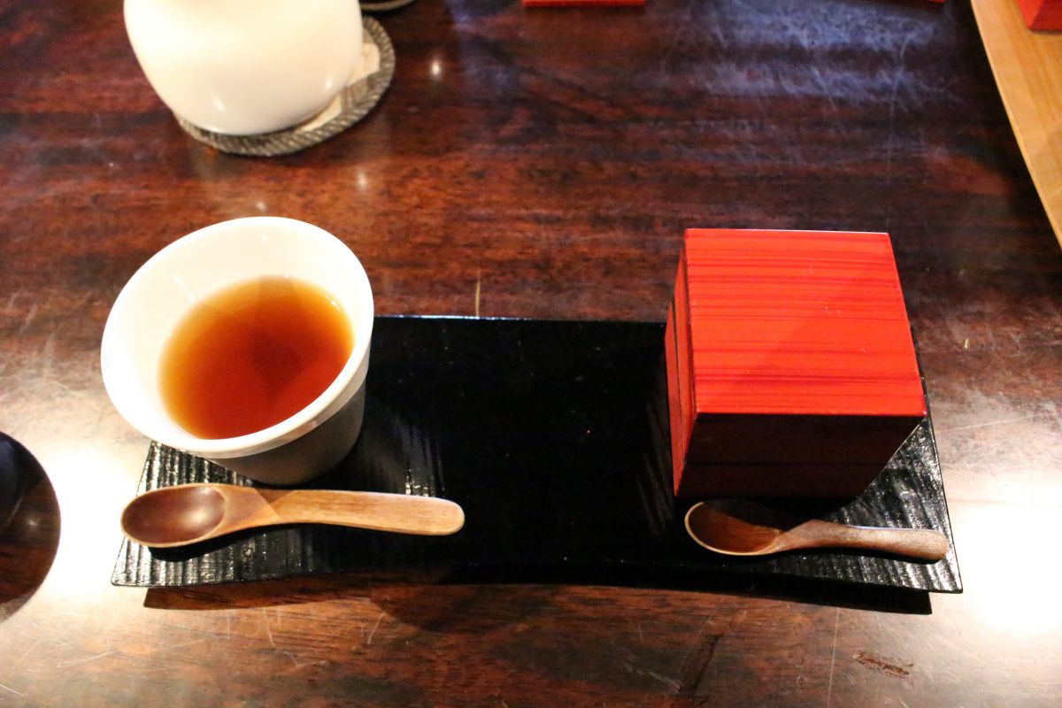 最後に運ばれてきたのはこちら。左側の紅茶はわかりますが、紅葉色をした正方形のお重は……。キニナル。