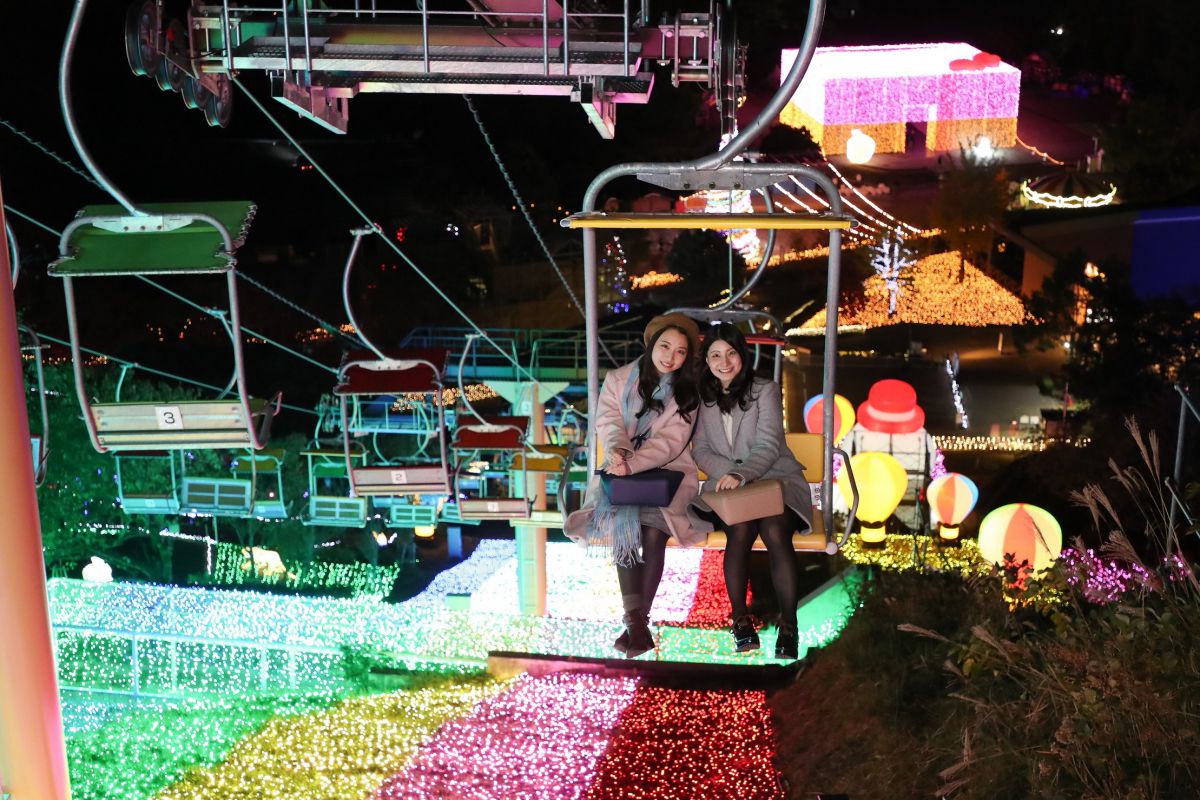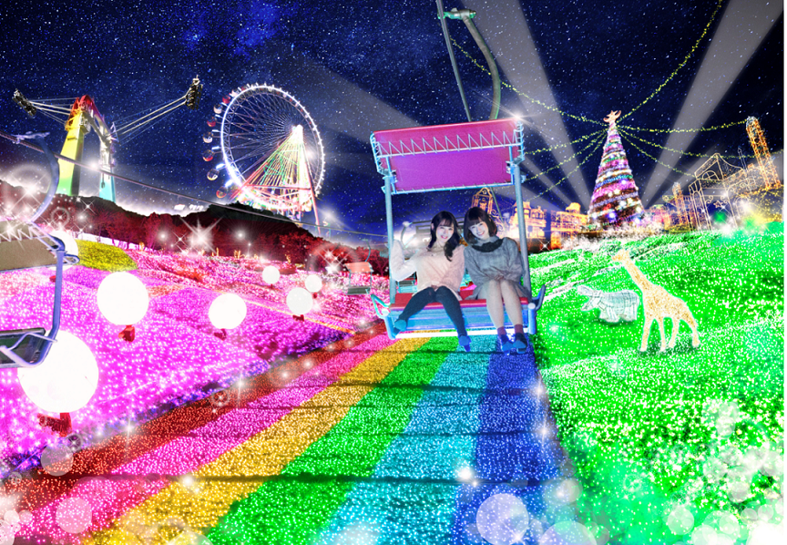 なかでも空から楽しむ体験型のイルミネーションが充実。全長250ⅿのリフトにのってイルミネーションの上空を空中散歩する「虹のリフト」は、光の虹の上を飛んでいるような気分になれます。