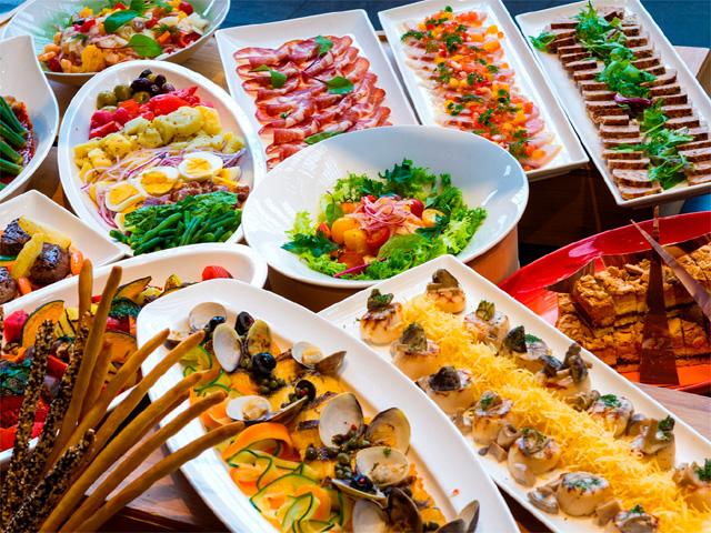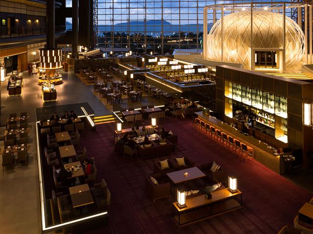 ヒルトン福岡シーホーク内にあるビュッフェレストラン。品数充実のビュッフェやカラフルなアラカルトなどの料理はもちろん、一面ガラス張りになったダイニングフロアも人気の理由のひとつです。高さ40m、頭上高く空を望める空間は解放感たっぷり。空の景色を楽しみながら、地元の食材や季節のメニューをいただきましょう。