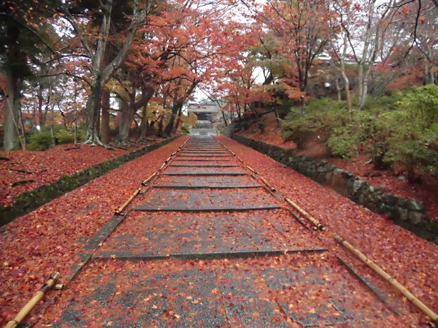 紅葉を敷き詰めた坂道がお出迎え!ひなびた山寺の風情を楽しんで