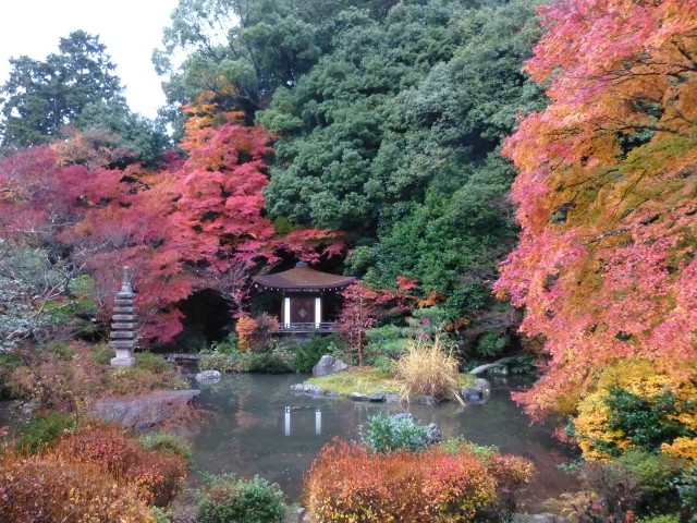氷室池を埋めつくすスイレンが有名な「勧修寺」は、春は桜、秋は紅葉と、四季の絶景を楽しめる寺として知られています。紅葉越しに見る観音堂や、境内を染める赤・黄・橙のグラデーションにうっとり。穴場スポットなので、混雑することなくのんびり観賞できるのもうれしいポイントです。