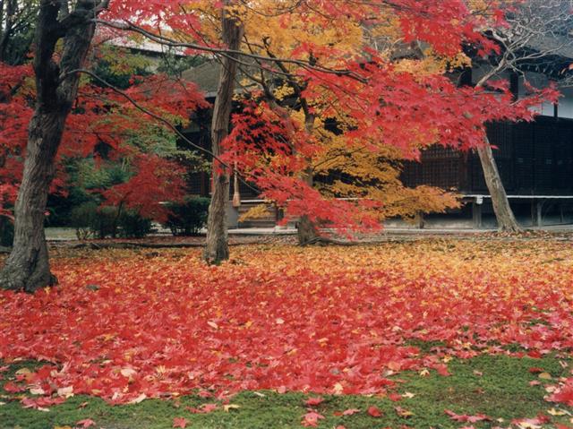 山科エリアを見下ろす山腹にあり、知る人ぞ知る紅葉の名所。ひなびた山寺のような佇まいと、鮮やかに色づく木々との対比に目を奪われます。見どころは、「勅使坂」を埋めつくす敷紅葉。紅い葉に覆われた坂を上っていると、レッドカーペットを歩いているような気分を味わえます。