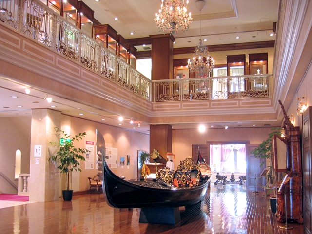 イタリアのヴェネツィアから取り寄せたガラス工芸作品や、イタリア製家具などが展示された美術館。宮殿のような建物に華やかなインテリアが特徴で、イタリアの貴族の優雅な暮らしや文化を垣間見ることができます。人気のコーナーは、貴族衣装に着替える衣装文化体験。ここではイタリア製のドレスで記念撮影ができます。イタリアのドレスメーカーに特注された貴族衣装に着替えたら気分は貴婦人。撮影時には思い切りなりきってどうぞ。