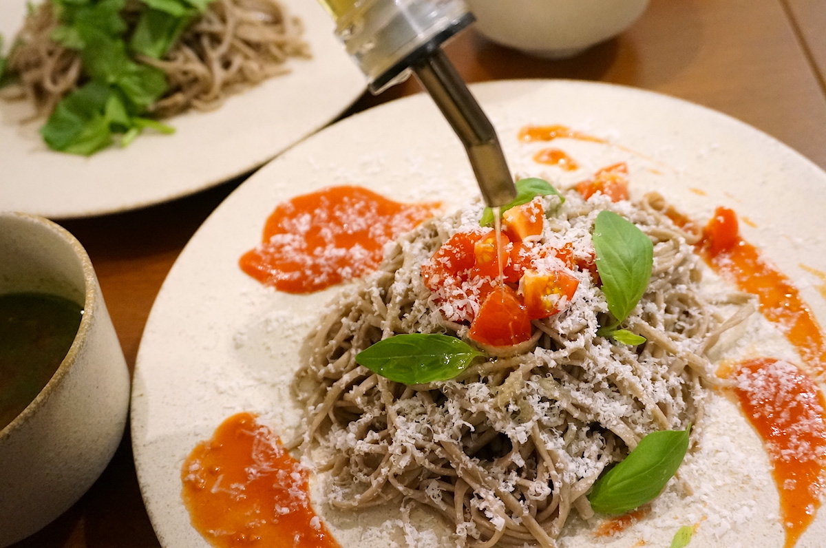 そんなオリジナリティあふれる創作料理の中でも看板メニューとなっているのが、信州そばにイタリアンのつけ汁を合わせた「ITAソバ」。
