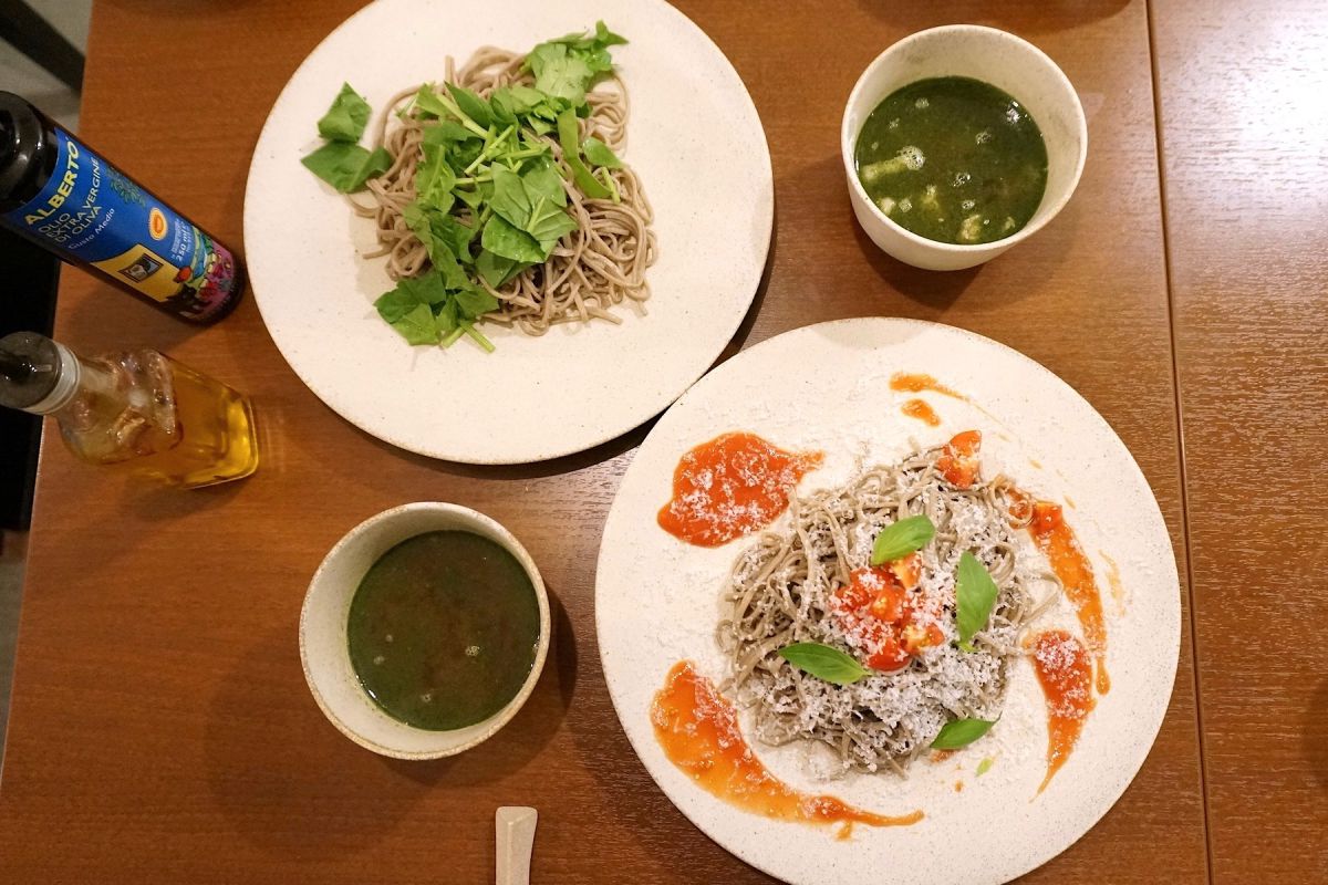 昆布とかつおを合わせた出汁に、ジェノベーゼ、ペペロンチーノ、トマトバジル、ボロネーゼ、ポルチーニを加えたつけ汁につけていただきます。