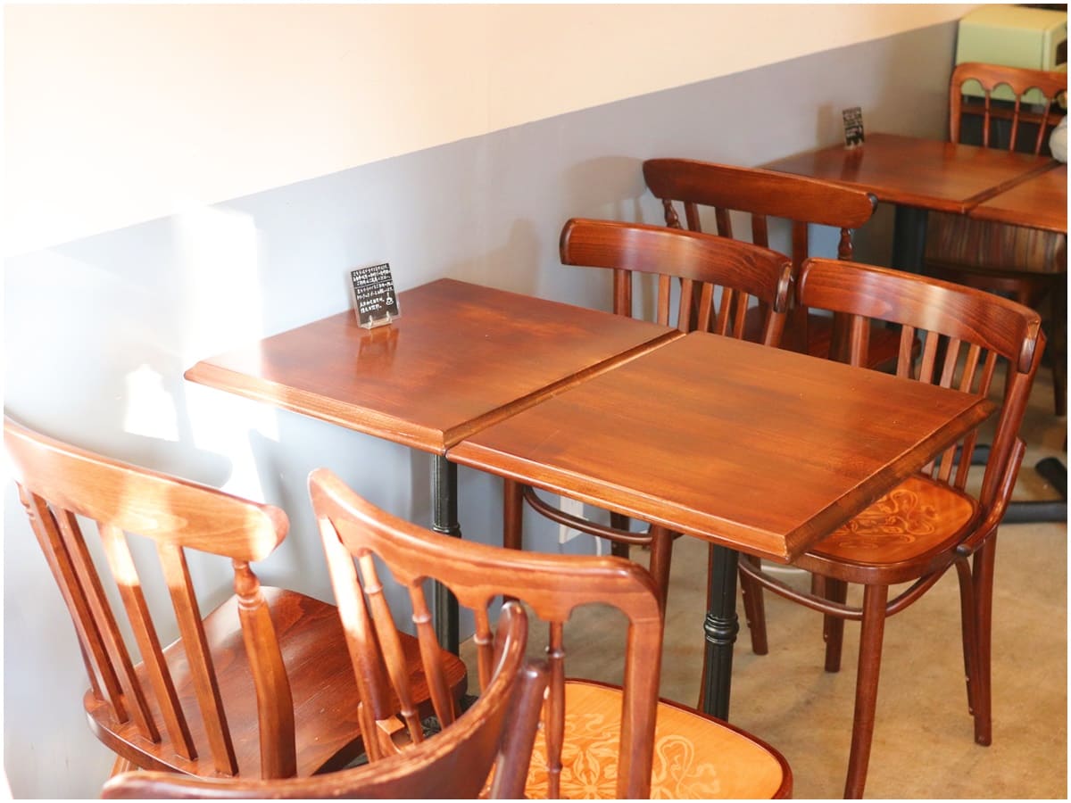 店内にはテーブル席が2つ。焼きたてのパンの香りと共に食事が楽しめますよ。
