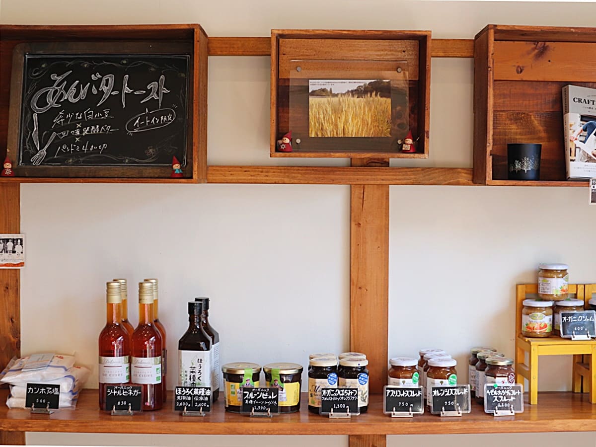 店内ではパンだけではなく、おすすめの調味料や日によっては無農薬のお野菜の販売も。
