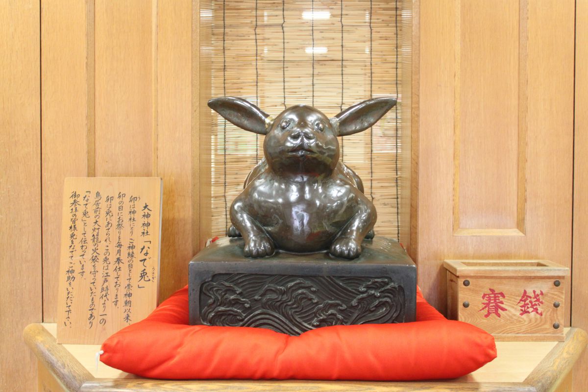 拝殿左、参集殿の入り口で参拝者を迎えてくれる「なで兎」は、ピーンと伸びたお耳が愛らしい!もともとは一の鳥居前で人々を見守っていましたが、時を経てここに戻ってきたそう。 なでることで運気がアップする、痛いところを癒やしてくれるといわれているカワイイ守り神。お正月にはたくさんの人々の手によって、さらにピカピカになるそうです!