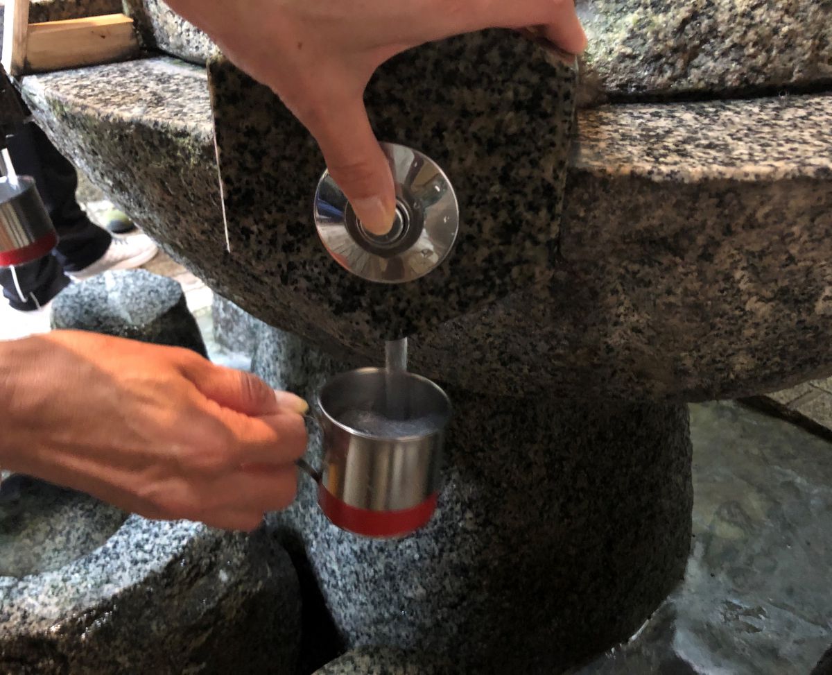 万病に効くという清らかな薬水が湧き出る「薬井戸」は、境内の左手に。備えつけのコップを使って自由にいただくことができます。やさしい口あたりのご神水に、ホッと癒やされるひととき。