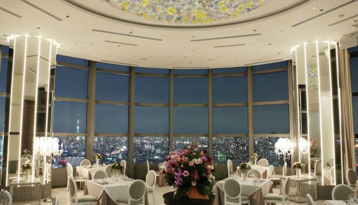 汐留のランドマーク「カレッタ汐留」最上階(47F)にあるフレンチレストラン。地上210m、270度を超えるパノラマビューは他では味わえない絶景!圧倒的な景色を気軽に楽しめる、デートや記念日におすすめのお店です。