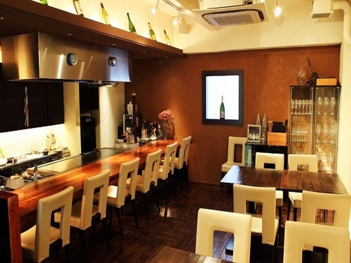 お客様の目の前で焼き上げる、ライブ感たっぷりの鉄板焼きが人気のお店。焼きあがっていく様子を見るだけで、気分が上がります。店内はカウンター6席とテーブル席が8席。どの席からも豪快な鉄板パフォーマンスをご覧いただけます。
