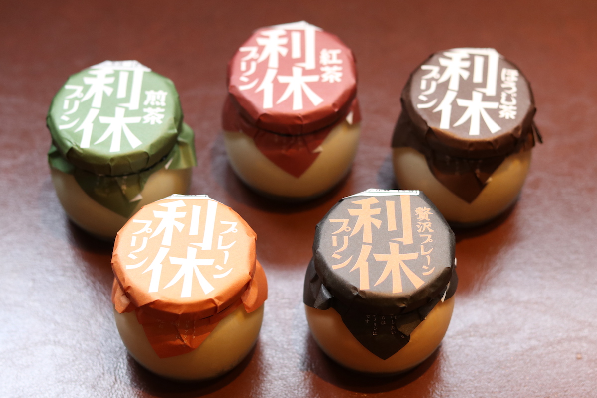 利休プリンは、プリンア・ラ・モードにも使われるシンプルな「プレーン」のほか、大分県産の龍の卵を使った「贅沢プレーン」、焙煎の香りが楽しめる「ほうじ茶」、渋味と甘味のバランスが絶妙な「煎茶」、アールグレイの華やかさが食欲をそそる「紅茶」の5種類を常時ラインナップ。これに、季節ごとの味わいが1、2種類プラスされます。