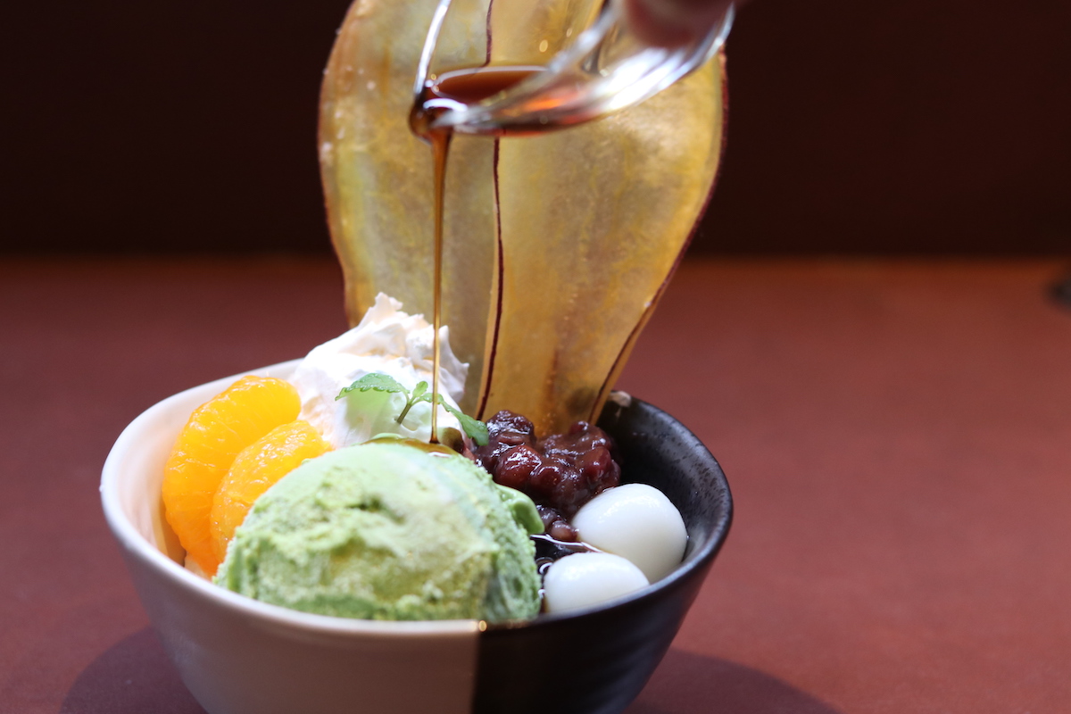 煎茶プリンが敷き詰められた器の上に、抹茶アイス、白玉、あんこ、生クリーム、フルーツ、さつまいもチップスをトッピング。別添えの黒蜜をたっぷりかけて、いただきます♪