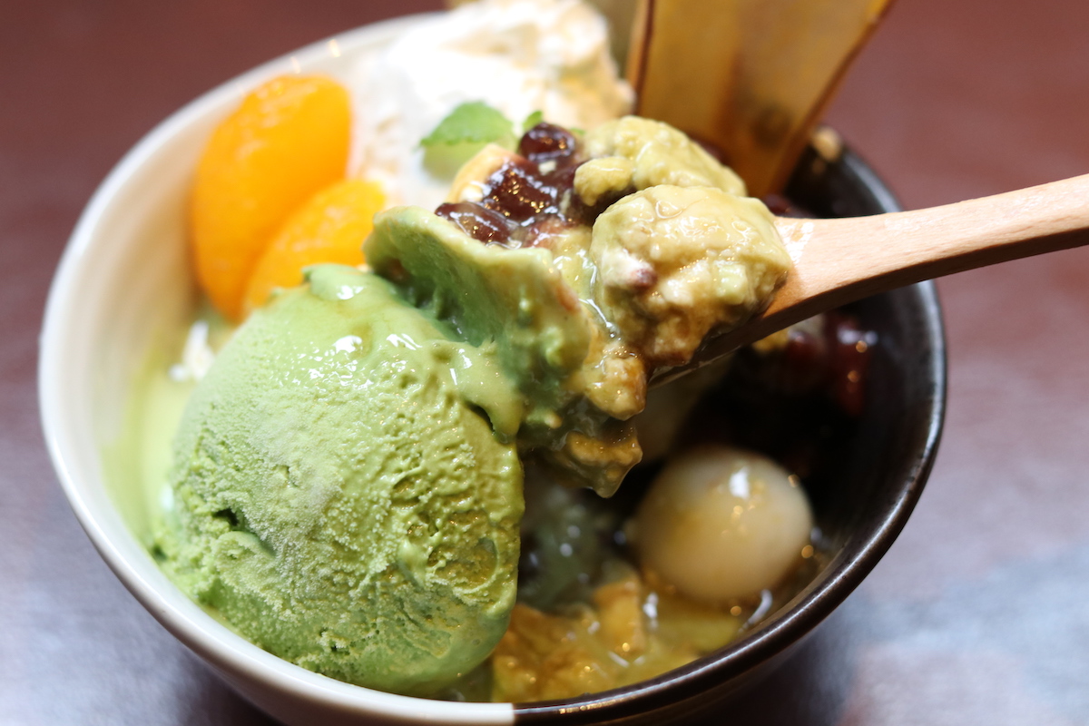 たっぷり入った煎茶プリンを、それぞれのトッピングに絡ませながら、ぱくり。煎茶プリンと抹茶アイスの苦味を楽しみつつ、あんこや生クリームの濃厚な甘味にうっとり。アイスが少し溶ければまろやかなソースとなり、さらにプリンを味わい深くしてくれます。