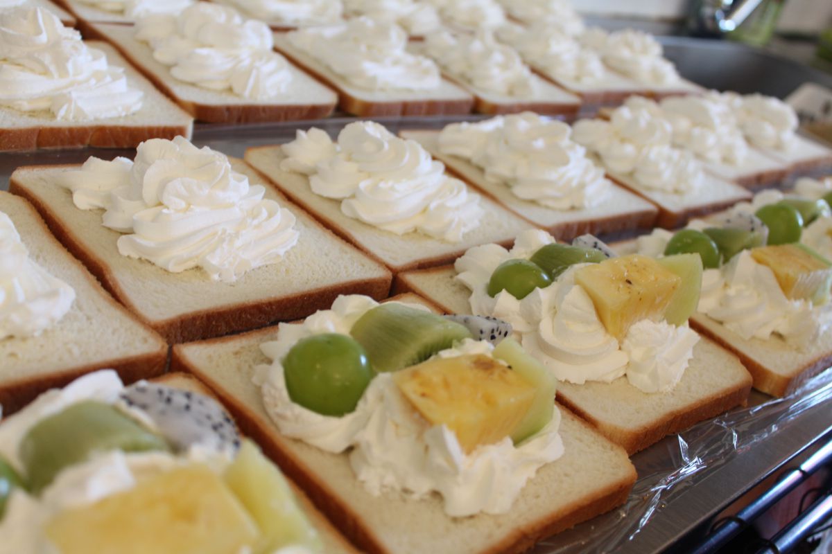 「フルーツサンドはフルーツの“見え方”に気を配っています」とスタッフさん。サンドイッチをスライスした時に一番美しく見えるよう、果物それぞれのカットや角度が工夫されています。インスタ女子にはうれしいポイント! たっぷりインされた生クリームは甘すぎず、フルーツを引き立ててくれる存在。あくまでも主役はフルーツです!