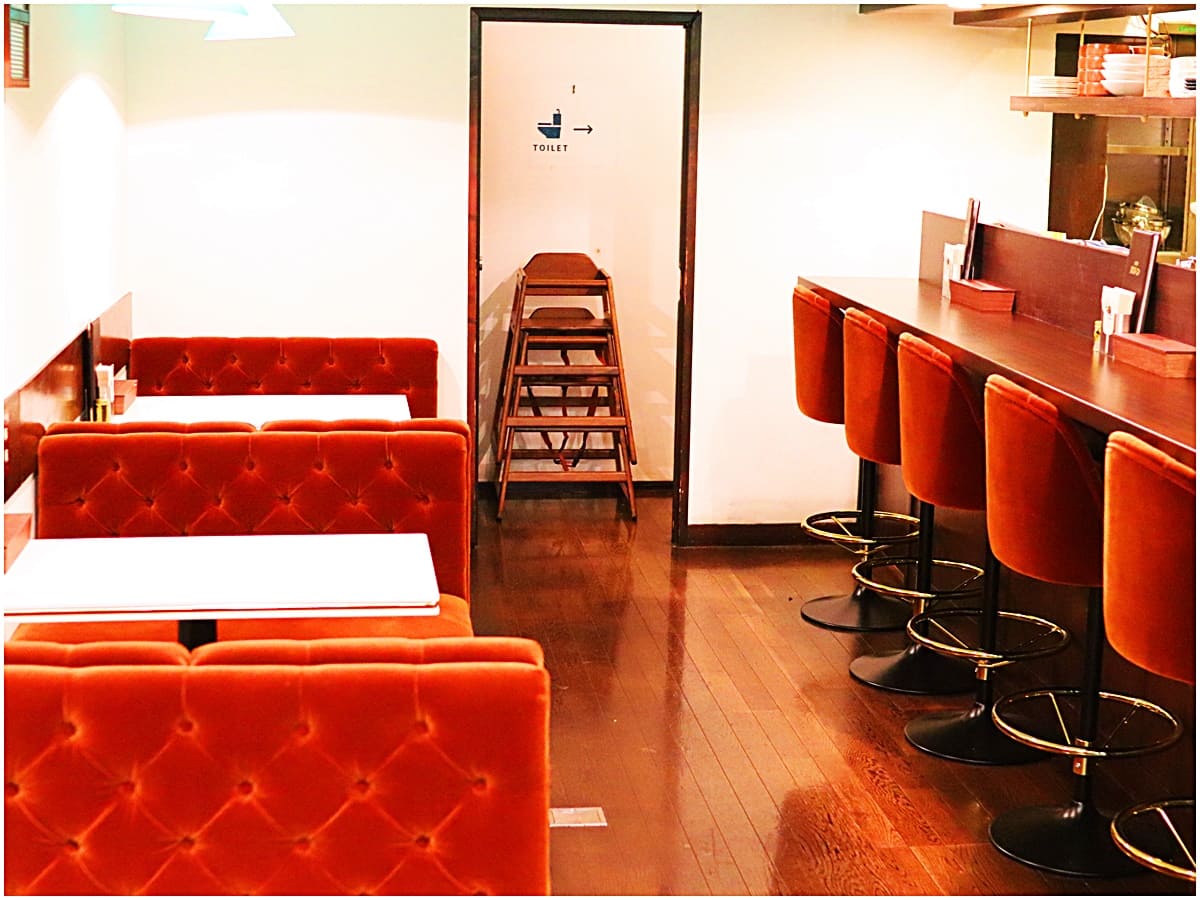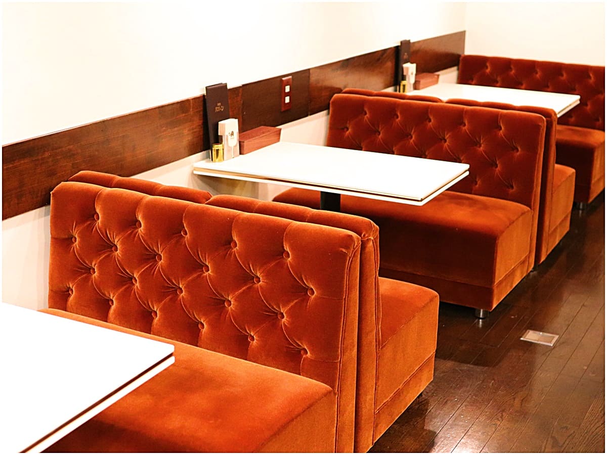 モダンなカラーの布張りで統一された椅子が、店内の白い壁に映えてとても素敵!