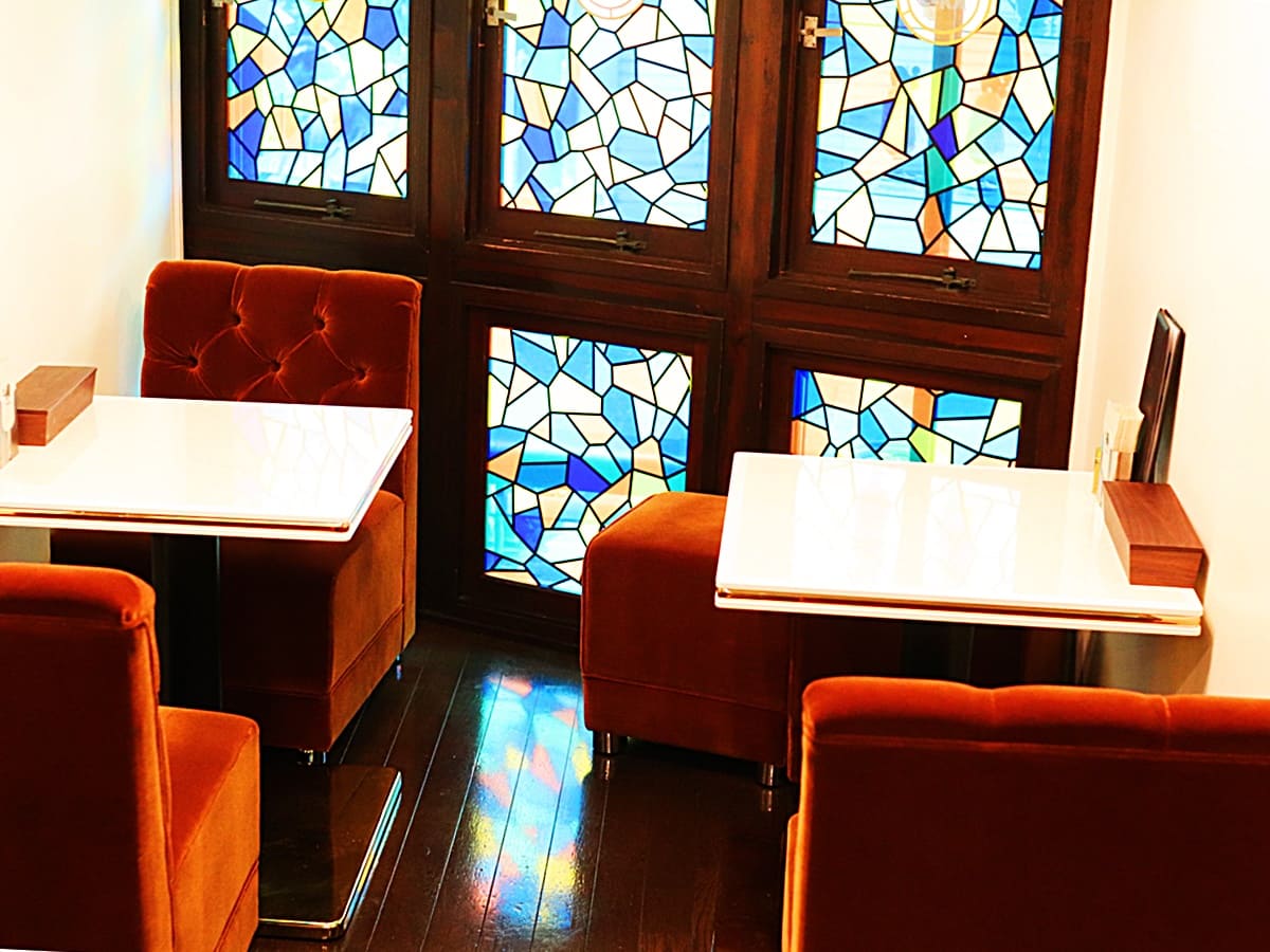 外から見えたステンドグラスの窓を背景に座れる、こちらの席もおすすめですよ。
