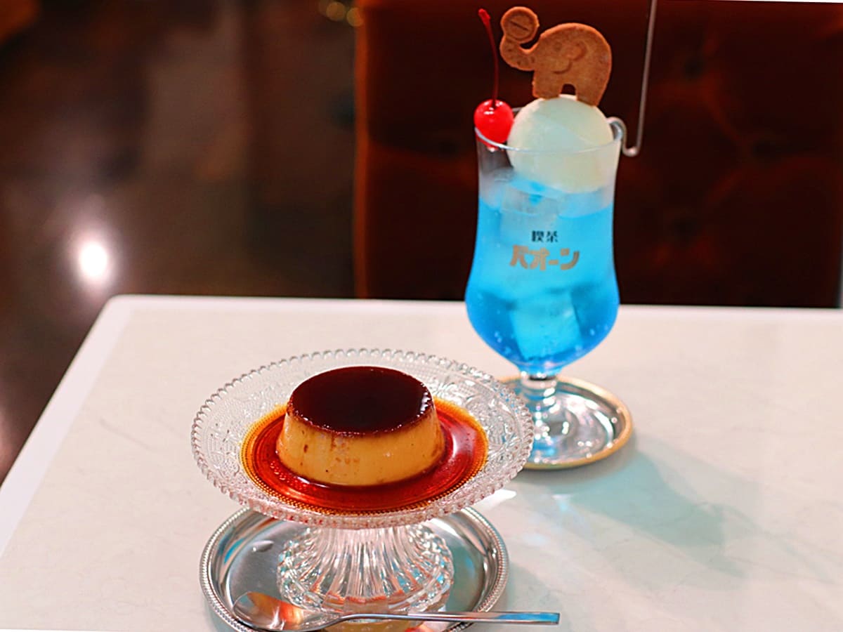 まずいただいたのは、人気メニューの「クリームソーダ クッキー付」(税別660円)と「カスタードプリン」(税別450円)。