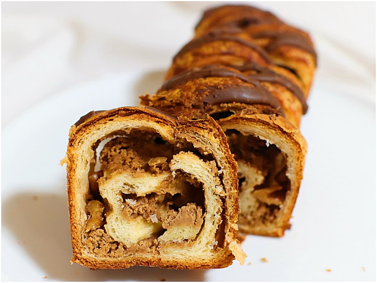 バターをたっぷり使用したリッチなデニッシュ生地のなかには、独自配合のコーヒーチョコクリームとクルミが。