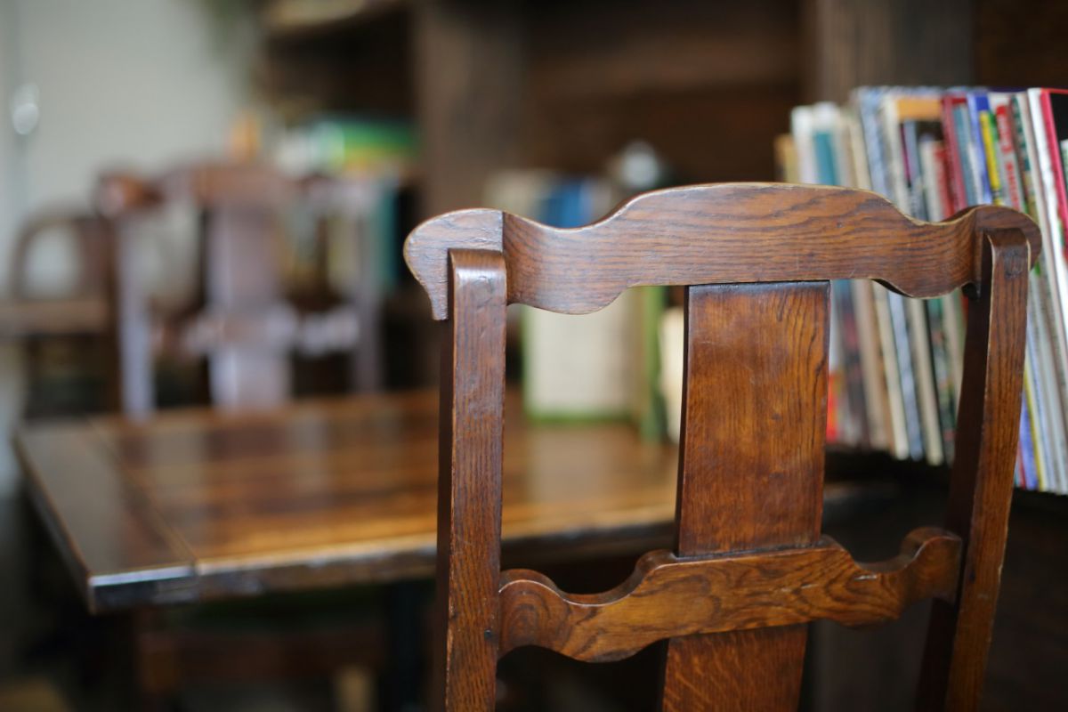 時を重ねた椅子に座って、ほっと一息。棚の本にも目が行きます。