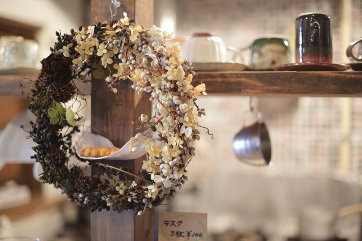 店主のハンドメイド作品に活用。ほんわか優しい空気が流れます。