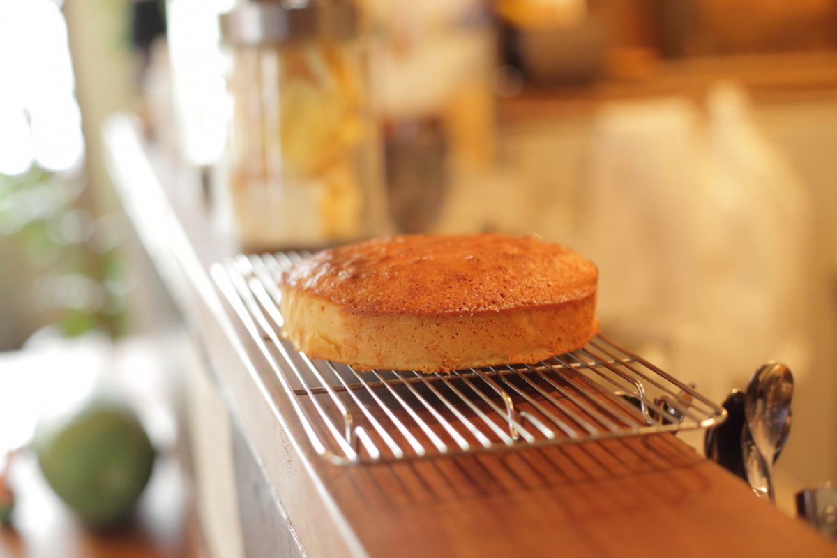 取材中、ケーキが焼き上がりました。カットして、午後のドリンクに無料でサービスされます。