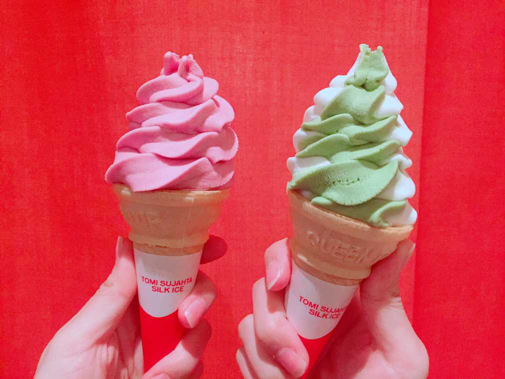 ロビーではお風呂上がりに人気のソフトクリームも食べられます。左から巨峰、抹茶バニラ各360円