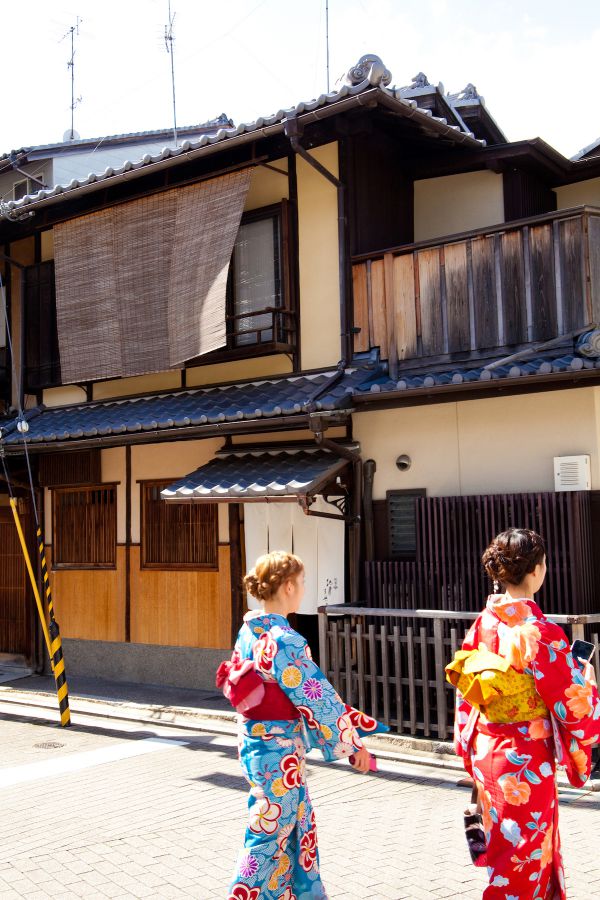 八坂神社から四条通りを河原町方向にまっすぐ行く途中、左に曲がるとあたりは時代が止まったような木造二階建ての建物が並ぶ、昔のままの景色が広がります。着物姿が映える町並み。