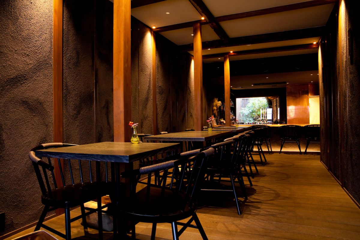 店内は、照明を落としたモダンな雰囲気。1階は手前がテーブル席、奥がカウンター席になっています。