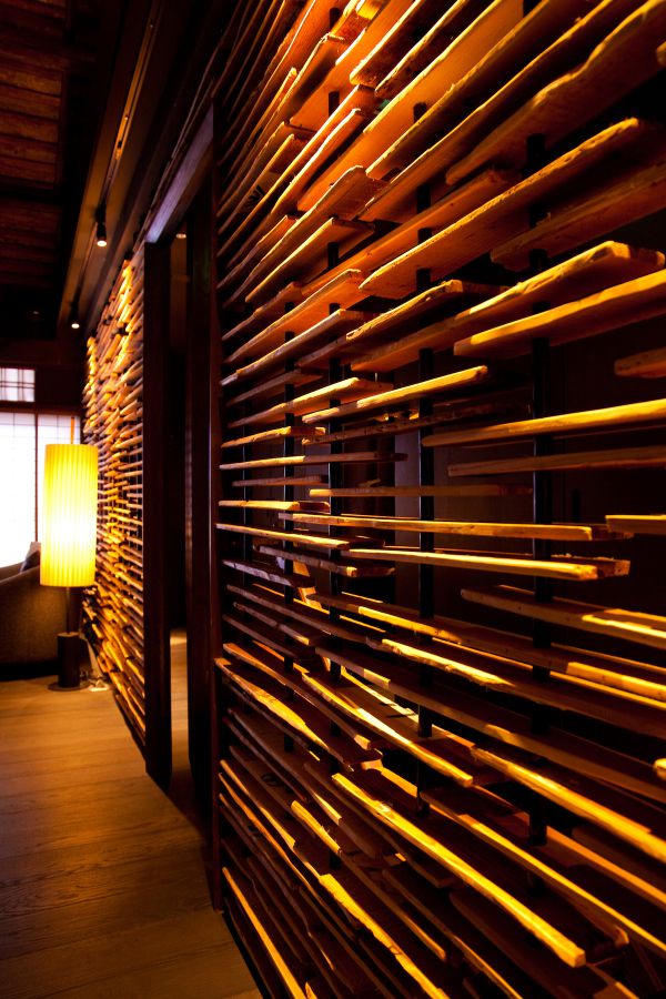 古い茶箱の木を割ってブラインドように仕上げた特徴的な壁がおしゃれ。