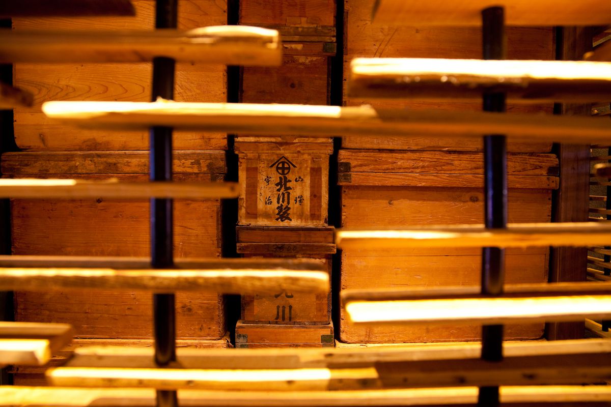 特徴的な壁の間を覗き見ると、文久元年創業の宇治茶問屋「北川半兵衞商店」の屋号紋のついた古い茶箱が、古い京町家に収まりよく並んでいます。