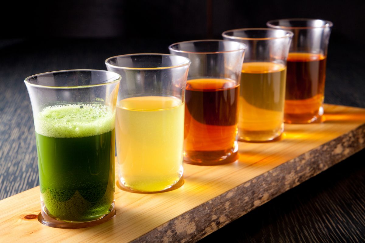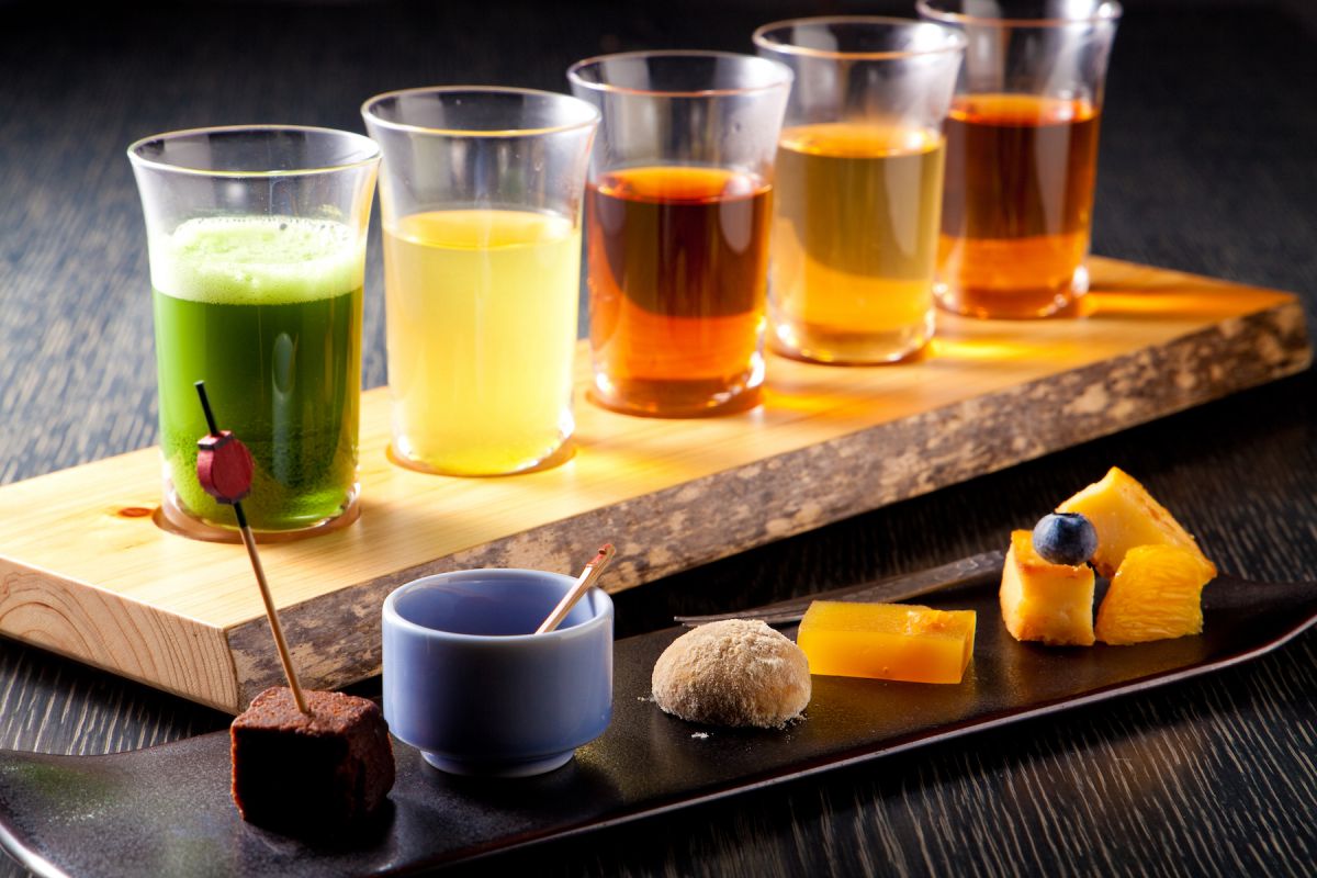 お茶は左から抹茶、煎茶、ほうじ茶、和烏龍茶、和紅茶と並びます。抹茶は、普段お茶席で亭主が点てているものをグラスで提供。お作法など気にせず、気軽に、純粋に味を楽しめます。