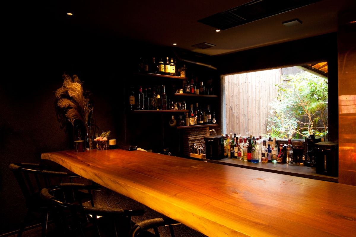 祇園の夜をしっぽりと過ごす夜の時間もおすすめです。京町家の特徴である坪庭に向かうた一枚板のカウンターが特等席。窓枠にはリキュール類がずらりと並んでいます。