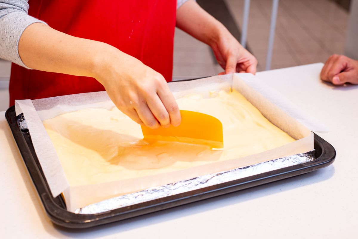 混ぜ終わったらオーブンの天板に流し入れ、ヘラで高さが均等になるように整えます。