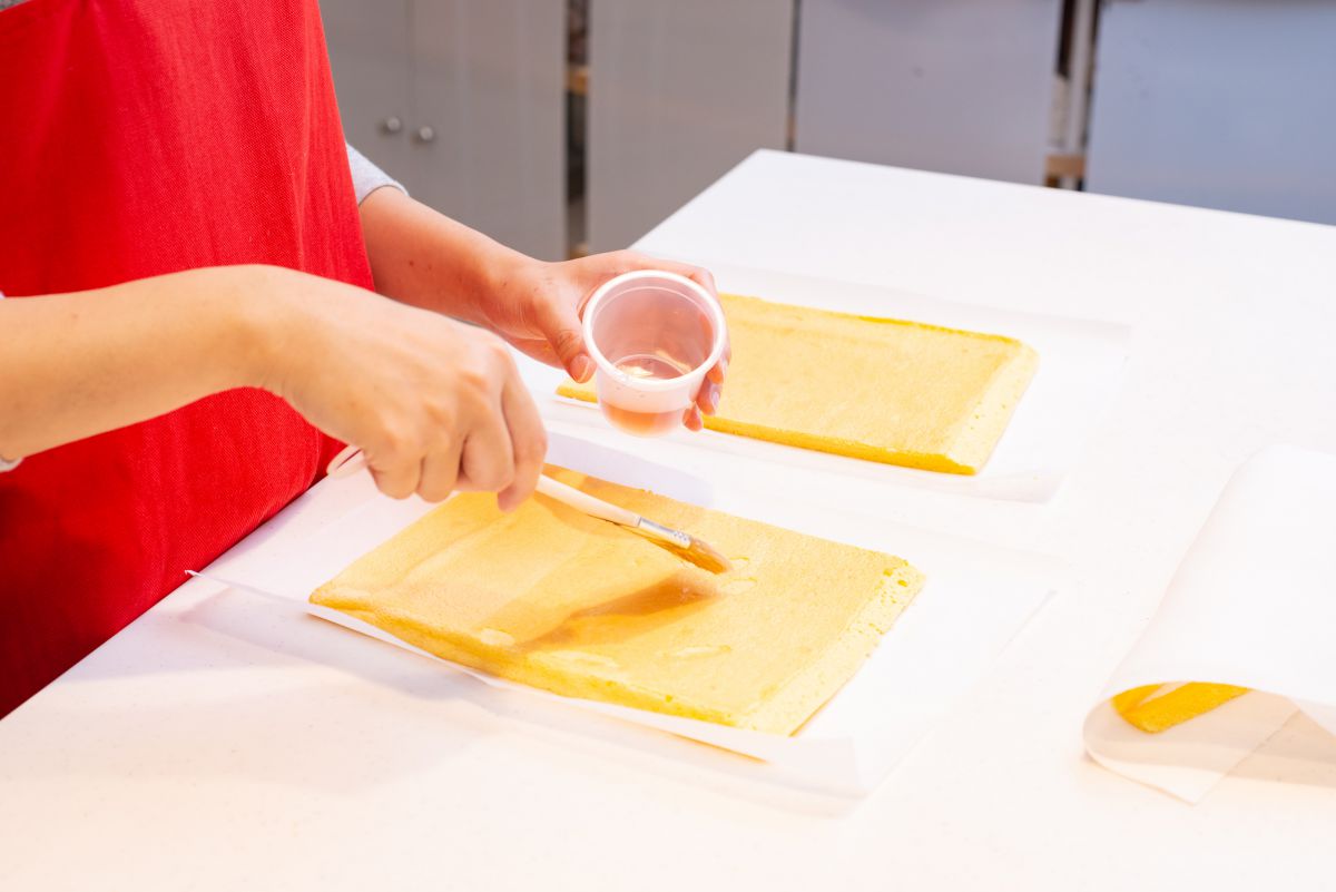 いよいよ焼き上がった生地。フランボワーズのリキュールを入れたシロップを塗っていきます。