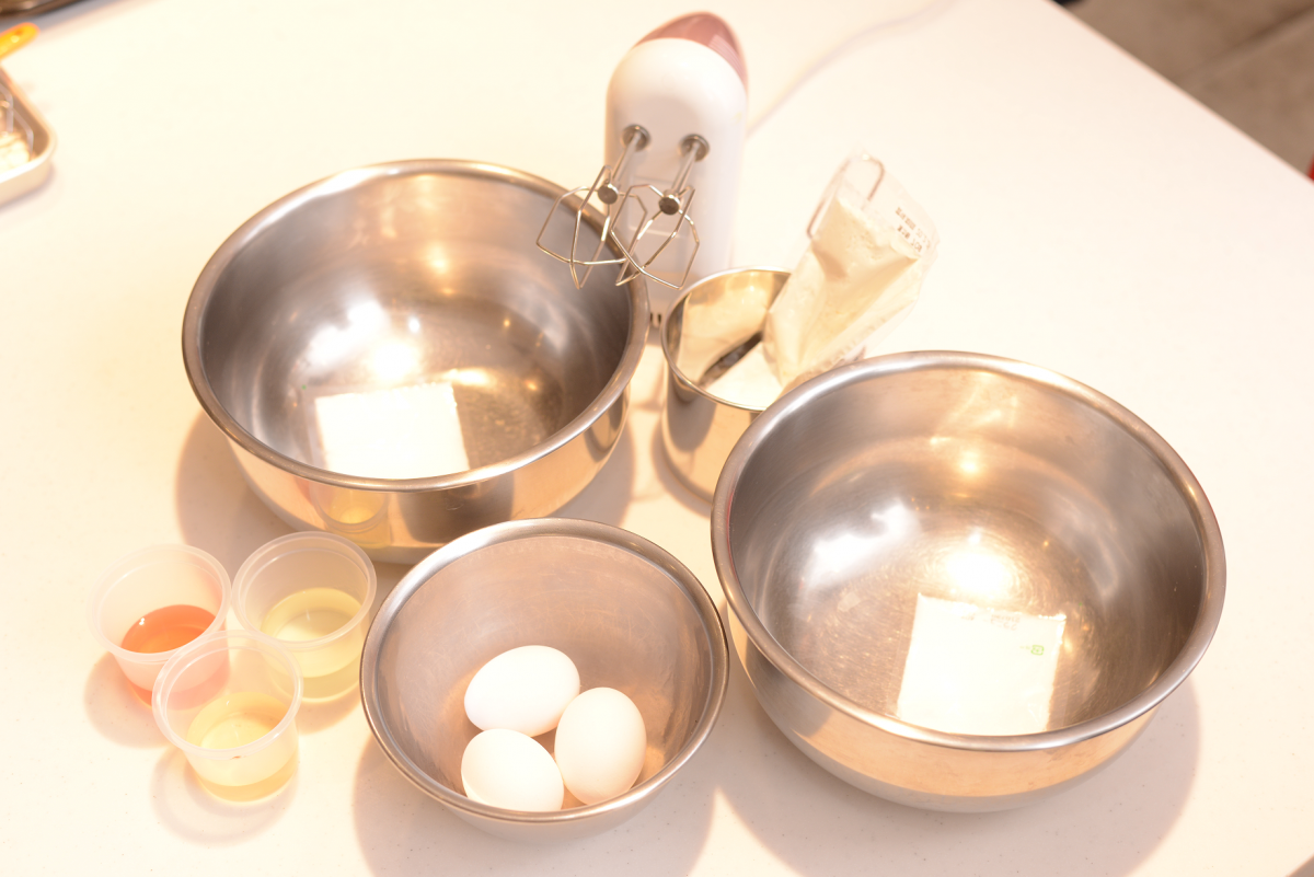 ケーキの土台となるシフォンの生地を作るため、まずは卵をボウルの中で泡立てていきます。