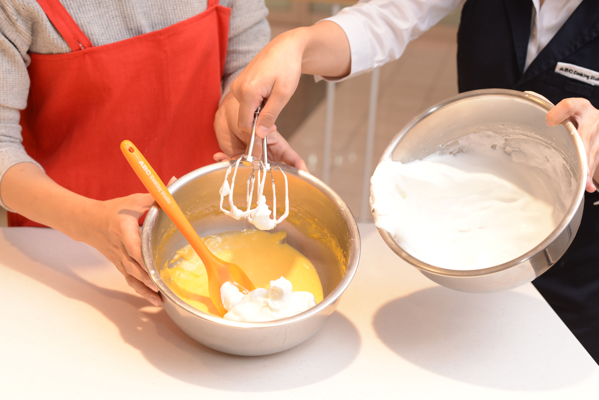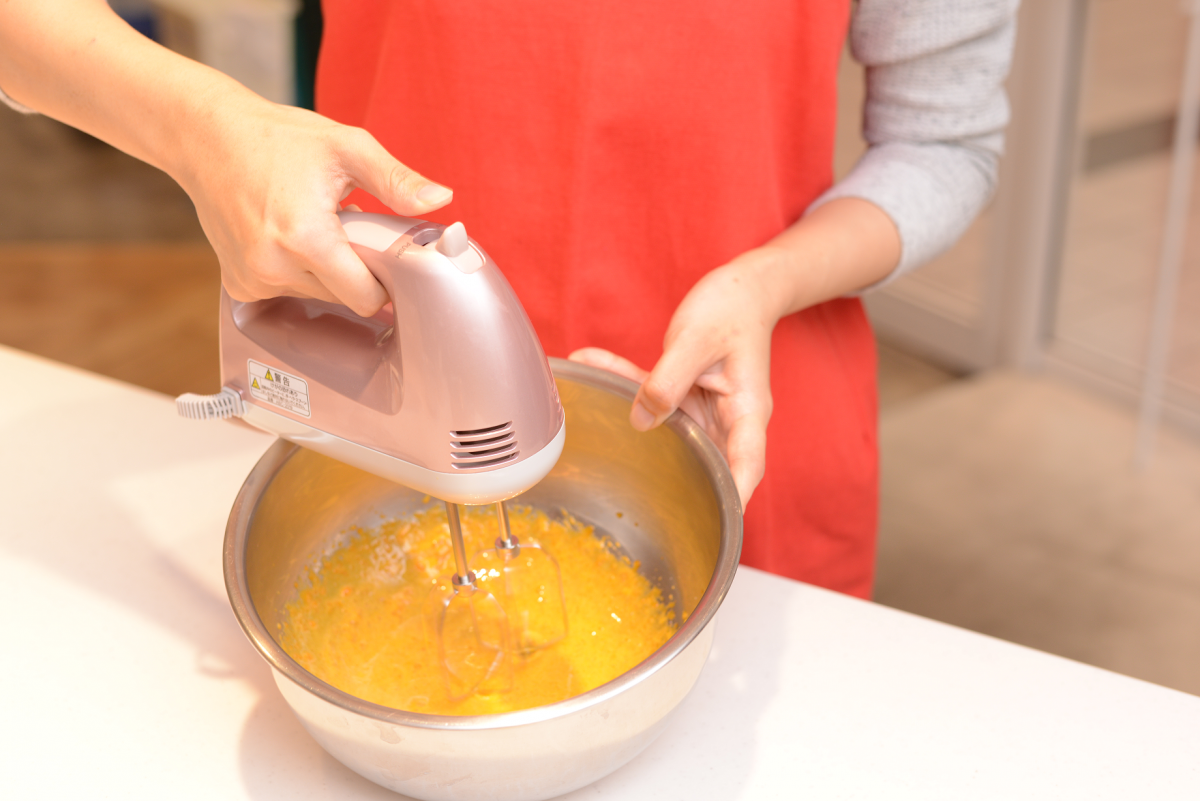 卵黄の中に砂糖などのさまざまな材料を順次投入しながらハンドミキサーでかき混ぜていきます。「実は、卵を割った後の、混ぜる工程に、シフォン生地を美しく作る秘訣があるのです」と言いながら、丁寧にお手本を見せてくれる寺田先生。