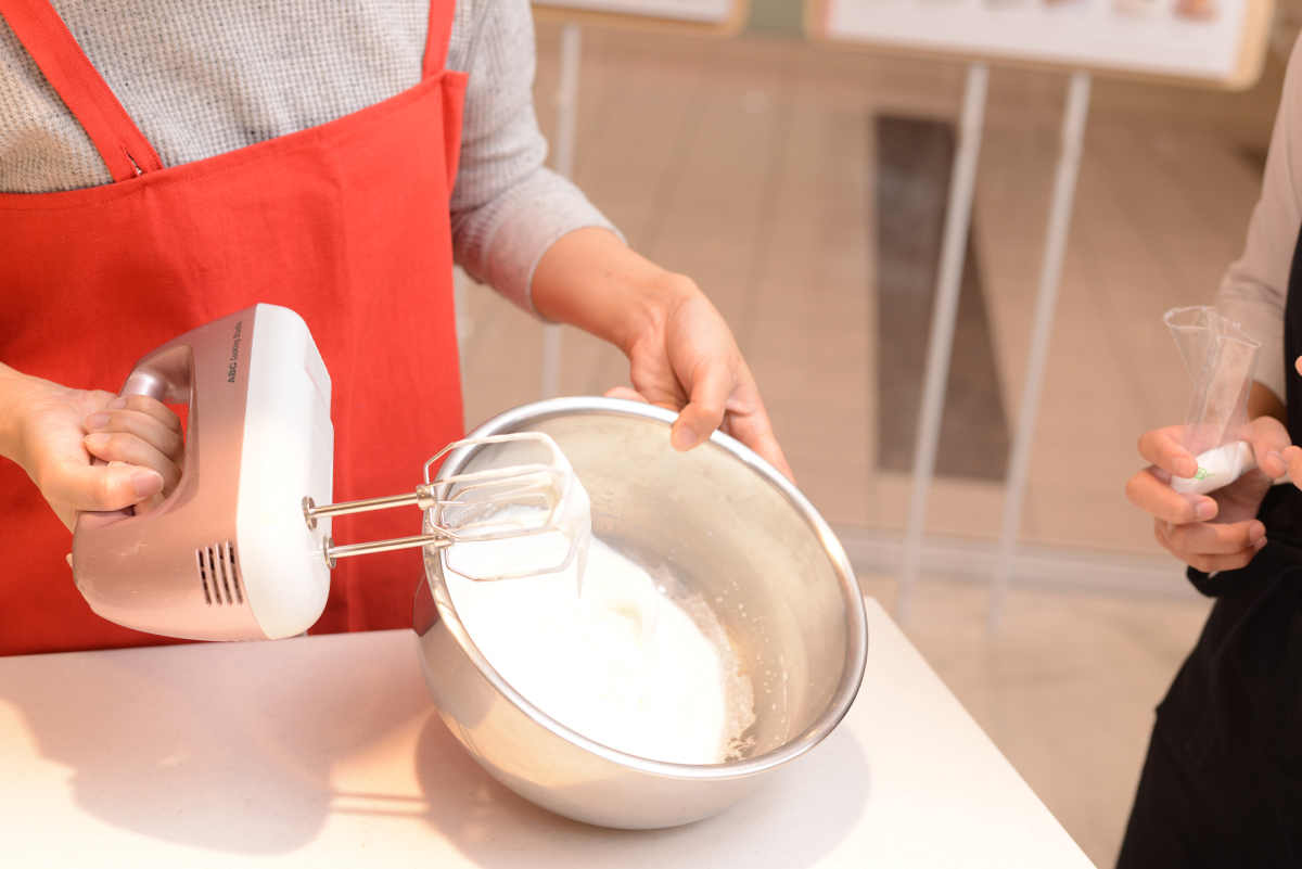 寺田先生「生クリームはぬるくなると固まりにくくなるので、できるだけ冷蔵庫から出したてを混ぜましょう。そして、ミキサーの回転速度を変えていくのもポイントです。ここで混ぜすぎるとボコボコになってしまうので注意したいところです」