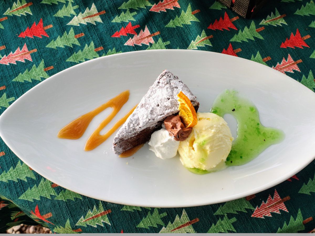 ケーキセットはガトーショコラ、ベイクドチーズ、りんごのタルトの3種類からケーキを選べ、ドリンクはコーヒーか紅茶の2種類から選べます。ケーキの乗ったプレートには、バニラアイスとホイップクリーム、自社農園で生産されたみかんチップスがトッピングされ、優雅なティータイムを演出してくれますよ。