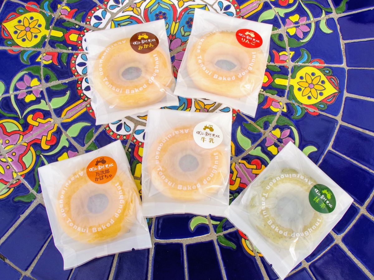 こちらは油で揚げずにオーブンで焼き上げた「焼ドーナツ」(184円・税込み)。万次郎かぼちゃ、牛乳、抹茶の通年商品のほか、季節限定フレーバーのみかんとりんごなど、さまざまな味のドーナツはお土産にもぴったりです。